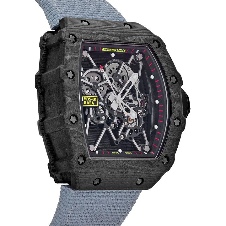 The Richard Mille RM 35-01 Rafael Nadal features a Black Carbon TPT case measuring 49.94mm x 42mm, embodying the brand’s signature blend of cutting-edge materials and featherweight construction.